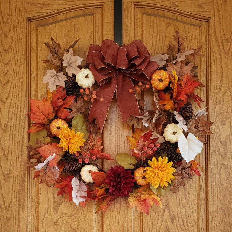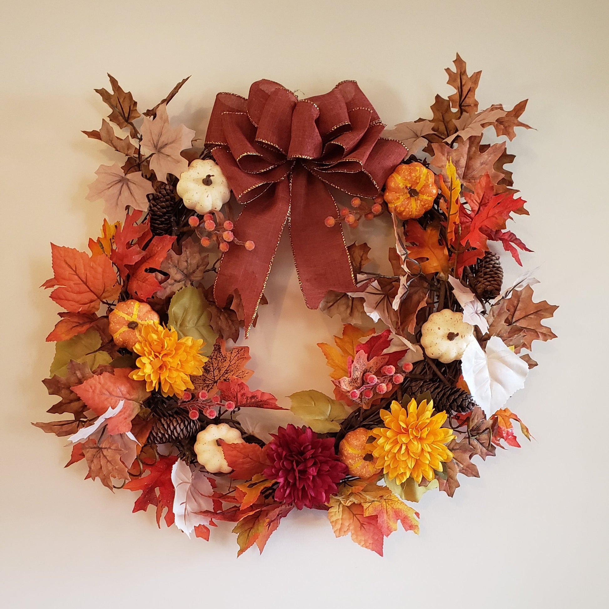 An 18-inch custom-built fall wreath consisting of fall leaves and chrysanthemums.