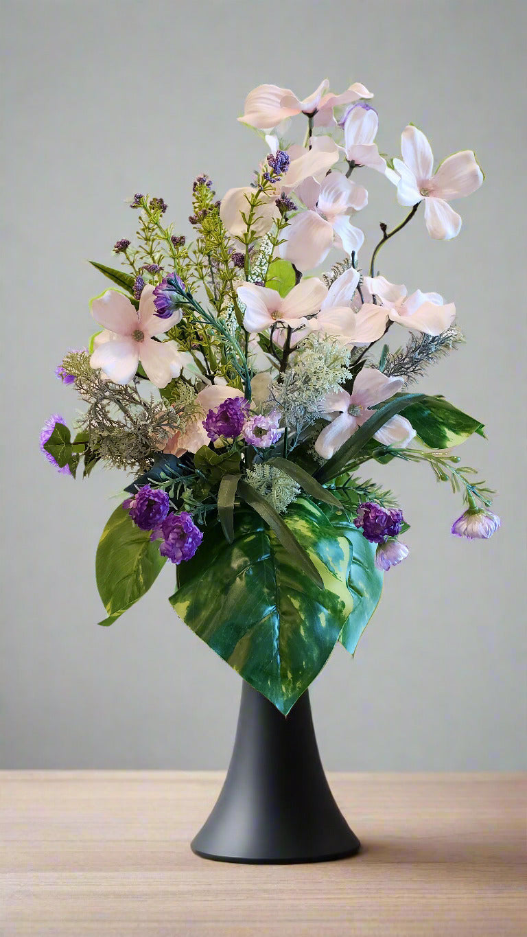 Light-pink dogwood blossoms surrounded by luscious greenery, accented by bursts of purple Lisanthus in an earthenware cup